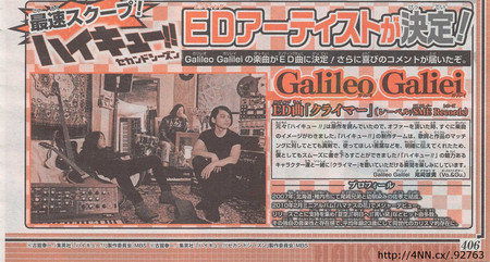 La edición 42 de la revista Weekly Shonen Jump de la editorial Shueisha ha anunciado el Lunes que la banda Galileo Galilei interpretará el tema musical de Ending titulado "Climber" para la segunda temporada de Anime para televisión de Haikyuu!!. El Anime se estrenará el 3 de Octubre del 2015 en Japón.